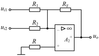 欲满足uo=-(ui1+ui2)的关系,则R1、R2、RF的阻值必须满足( )。