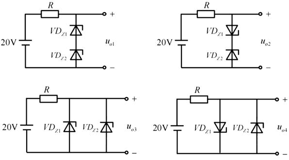 设硅稳压管VDz1和VDz2稳定电压分别为5V和10V,正向压降均为0.7V,则四个电路的输出电压顺序为( )。