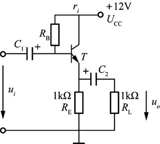 基本电压放大电路,已知UBE=0.7,β=50,rbe=588Ω,RB=75kΩ,求电压放大倍数Au和输入电阻ri( )