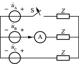 电路如图所示,Y—Y对称三相电路中原先电流表指示1A(有效值)。后因故障A相断开(即S打开),此时电流表读数为( )。