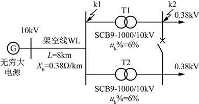 图所示为某无穷大电力系统,SB=100MVA,两台变压器并联运行下k2点的三相短路电流的标幺值为(  )。