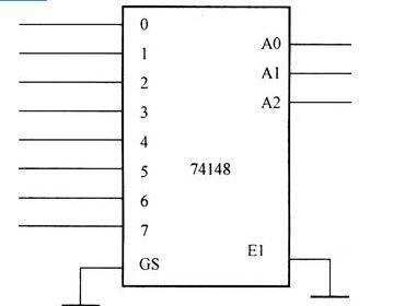 如图所示,优先权编码器74148有8条输入线0~7,3条输出线A0~A2。当GS为0时编码器输出有效,E1为0时允许模块