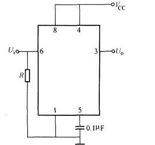 用555定时器构成的单稳态电路如图所示。已知电源电压VCC=10V,R=33kΩ,C=0.1μF,则输出电压的脉冲宽度为