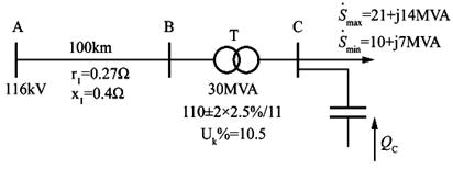 简单系统如图所示,输电端母线A电压保持116kV,变压器低压母线C要求恒调压,电压保持10.5kV,满足以上要求时接在母