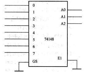 如图所示,优先权编码器74148有8条输入线0~7,3条输出线A0~A2。当GS为0时编码器输出有效,E1为0时允许模块