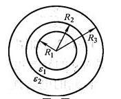 如图所示,一个圆柱形电容器中有两层同轴圆柱形均匀电介质,内导体半径R1=1cm,外导体半径R3=4cm,内层介质介电系数
