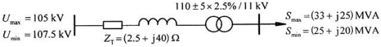 如图所示,某变电所装有一变比为110±5×2.5%/11kV,STN=31.5MVA的降压变压器,变电所高压母线电压、变压器归算到高压侧的阻抗及负载均标在图中,若欲保证变电所低压母线电压Umax=10kV,Umin=10.5kV,在忽略变压器功率损耗和电压降落横分量的情况下,变压器分接头为(  )。