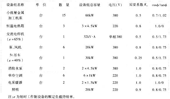 单项选择题 某小型企业拟新建检修车间、办公附属房屋和10/0.4kV车间变电所各一处。变电所设变压器一台,车间的用电负荷及有关参数见下表。