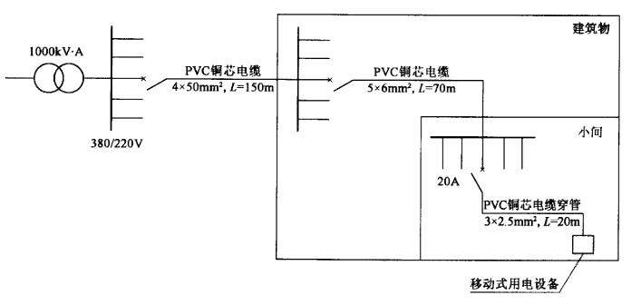 单项选择题 某座建筑物由一台1000kV*A变压器釆用TN-C-S系统供电,线路材质、长度和截面如下图所示,图中小间有移