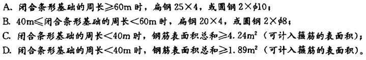 多项选择题 第二类防雷建筑物,当在建筑物周边的无钢筋的闭合条形混凝土基础内敷设人工 基础接地体时,接地体的最小规格尺寸符