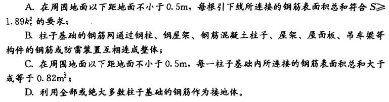 多项选择题 第二类防雷建筑物,在防雷的接地装置同其他接地装置和进出建筑物的管道相连 的情况下,对6m柱距或大多数柱距为6m的单层工业建筑物,当利用柱子基础的钢筋作为 外部防雷装置的接地体并符合下列条件()时,可不另加接地体。