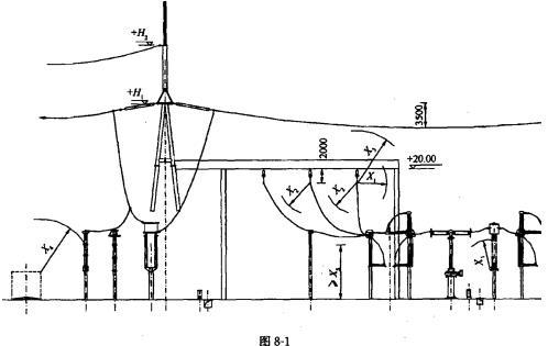 单选题 500kV配电装置采用软母线,导线直径为50mm,其局部断面图如图8-1所示(母线挂线点髙度为20m,导线弧垂尺寸,跨线为3500mm,母线弧垂为2000mm),请根据以下各题要求分析(或计算)回答问题。