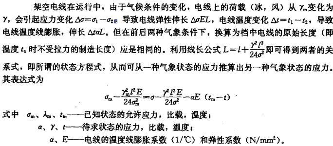 电线最大允许使用应力σm(拉断应力除额定安全系数),一般出现在电线覆冰设计最大冰的气象条件(―5℃,有冰,有风,γ7),以此为起始条件,可推算电线运行中各种气象条件(γ,t)的应力σ(在北方寒冷地区的小档距,最大应力也可能出现在最低气温,在无冰、轻冰的南方温热地区,最大应力也可能由大风或防震控制,则相应变为起始的计算气象条件)。