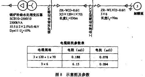 —台卸酸泵电动机功率为3kW,由锅炉补给水处理PC通过工业废水处理MCC供电,如图8所示。已知锅炉补给水处理变压器2500kVA,阻抗Ud=10%,电阻R=0.38mΩ,电抗X=3.84mΩ,接于PC盘上的电动机总功率为581kW,接于MCC盘上电动机总功率为140kW(不含卸酸泵),电缆参数见图上标注。变压器采用干式,与PC盘并列布置。假定忽略PC及MCC盘内母排及元件的电阻和电抗,试计算卸酸泵电动机出口三相短路电流为()。