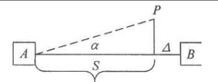 如图,利用小角法测定观测点P与基准线AB间的水平位移Δ,已知P点距A点的距离S为40m,测角中误差为±5″,在不考虑距离