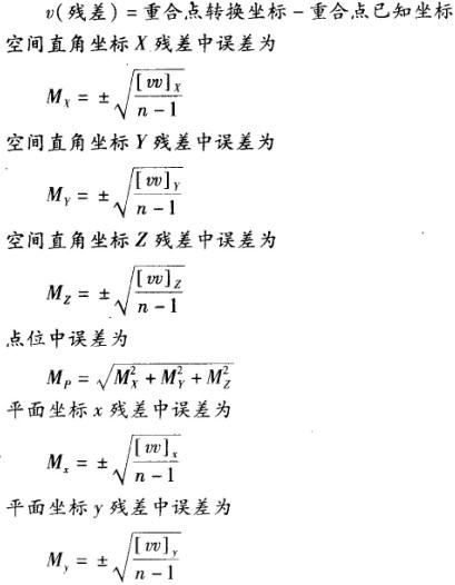 (3)依据计算坐标转换参数的重合点的残差中误差评估坐标转换精度。对于n个点,坐标转换精度估计公式如下。