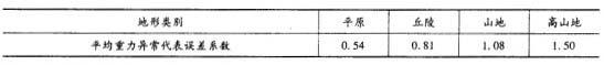 式中:δ g 为格网平均重力异常代表误差,单位为10 -5 m/s 2 ;λ为平均重力异常格网分辨率,单位为角分;c为平均重力异常代表误差系数,各种地形类别对应的平均重力异常代表误差系数按下表的规定执行。