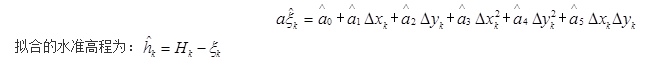 选取n个(n一般要求大于待估参数个数,本题待估参数为6)在测区内分布合适的公共点(同时具有三等水准高程和GPS大地高程点)。设各点数据为(xi,yi,Hi,hi,其中i=1,2,…,n),H为大地高,h为水准高程。