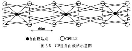 ⑧CPⅢ平面网观测的自由测站间距一般约为120m,自由测站到CPⅢ点的最远观测距离不应大于180m;每个CPⅢ点至少应保证有3个自由测站的方向和距离观测量。