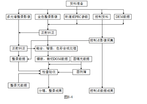 1.主要包括资料准备、技术路线设定、定向建模、DEM获取、影像纠正、色彩调整、影像镶嵌、影像裁切、质量检查及成果提交等环节。基于卫星遥感影像的DOM生产流程图如图8-4所示。