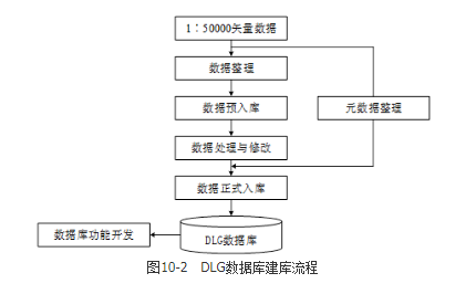 3.DLG数据库建库流程内容包括数据整理,数据预入库,数据处理与修改,元数据整理,数据正式入库,数据库功能开发,用框图描述流程如图10-2所示。