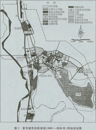 (2)从方案中发现,沿高速公路的3个组团均布置了工业用地,从表面上看,工业似乎放在了交通非常方便的地方。实际上,高速公路与城市连接的出入口在中心城区西侧,在3个组团处并没有出入口。因此,工业运输并不能方便地利用高速公路。同时工业用地布局过于分散,而且沿高速公路过多地布置工业区,对高速公路沿线城市形象不利,与历史文化名城及旅游服务基地的城市性质也不相符。