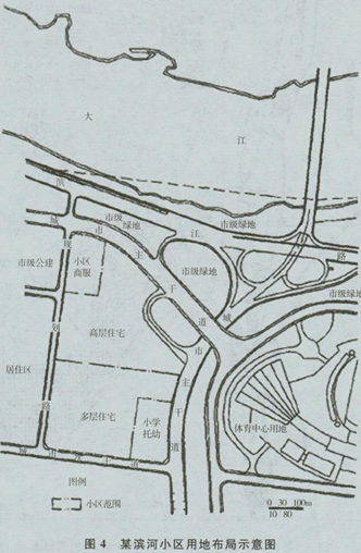 为河流及市级绿地,西侧为市级公建及居住区,东侧为市级体育中心;小区周边的道路条件为:东侧、北侧有城市主干道,南侧为城市次干道;小区的用地功能内容有:高层住宅、多层住宅、小区商服、小学托幼。我们可以分析一下布局中的问题:(1)该小区的主要景观朝向为北侧的大江及市级绿地,方案中把高层建筑布置在这一侧,挡住了后面的多层住宅的良好景观,而且如果低层、多层住宅布置在北侧,高层建筑布置在南侧,从滨江一侧看去可以形成层次丰富的建筑景观。(2)小学和托幼均应独立占地。方案中将小学托幼布置在同一地块是不正确的。(3)小学、托幼设在城市主干道、次干道交叉口,城市车流量较大,对学生出行安全的威胁较大;同时小学、托幼的位置在小区中偏东南,北侧住宅超过服务半径要求,应调整沿西侧规划路的比较靠近中心的位置。(4)小区商服位置偏于用地西北侧一隅,南侧住宅的居民购物距离较远,不方便。且小区的配套商服主要为小区内部居民服务,不宜临城市主干路设置。(5)缺少集中公共绿地,宜布置在用地居中位置,呈线状与北侧小区商服,市级绿地相接,同时满足小区内的景观均匀性。