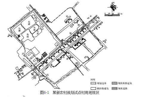 案例题 某村为新农村规划建设试点村。该村地势平坦,水系丰富,总用地面积为13.6hm2。用地现状图和规划图分别如图6-1和图6-2所示。