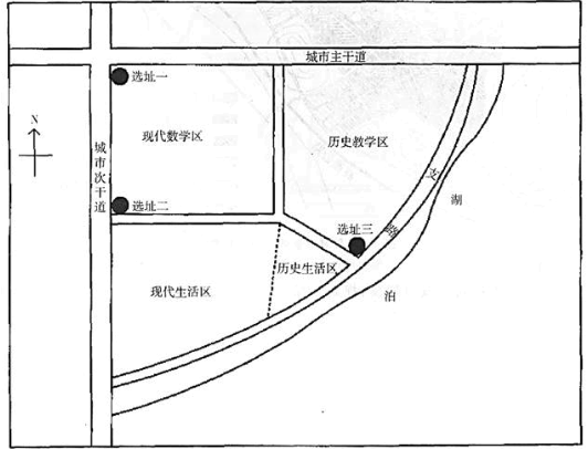 案例题 某市政府拟出资与所辖某百年名校在校内共建一处兼具城市功能的5000座体育馆。该校位于城市中心区,校区东南两侧为城市湖泊及支路,其北侧紧邻城市主干道,西侧为城市次干道。该校用地布置说明:北为教学区,南为生活区,其校区东部环境良好,大部分建筑为国家和西方建设,该单位及优秀历史建筑已被该市公布为历史风貌保护区。校区西部为上世纪70年代后所拓展区域,该校现为新建体育馆提出了三处选址方案(详见图5)。