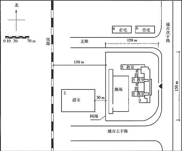 案例题 图所示为某市市区边缘地段拟建的一所18班小学。 图某小学及其外部环境示意图 【问题】 请指出该小学在选址和总平面