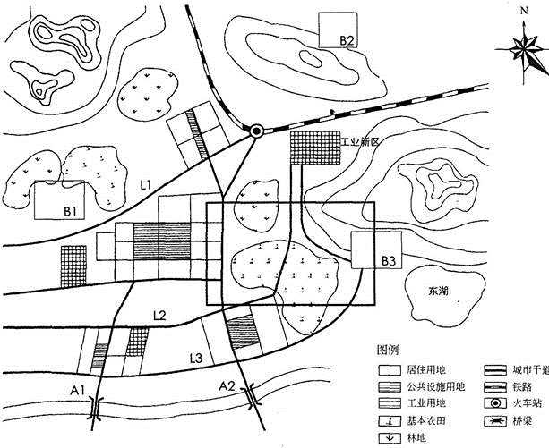 B1侵占基本农田。B2在山地北侧日照不利,跨越铁路,距现状用地远,无道路联系。L2穿越基本农田。因此都排除,并选择L3。B3背山近水环境好,地形坡度不大,位于主导风的上风向,山体阻隔工业用地不利影响,有1、3与现状用地和工业新区联系,因此保留。