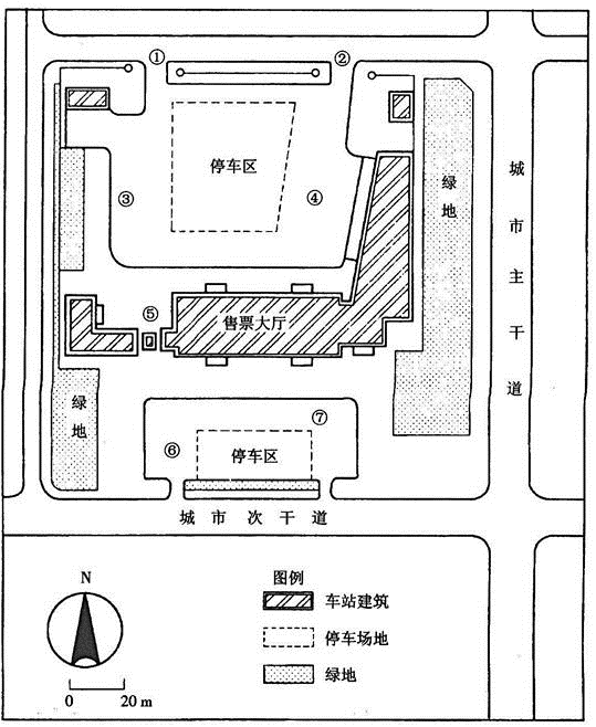 车辆进站出站流线应当顺应城市道路中的车辆行驶方式,一般以右转进出为宜。长途汽车为大型客车,所需停车空间较大,位于车站建筑后侧,城市小汽车所需停车空间较小,位于站前广场。长途车到达区应靠近旅客出站口,并与城市接客车辆上客区有良好联系。长途车发车区应靠近候车大厅。从长途车到发流线、城市接送客车辆流、旅客出发流线、旅客到达流线四个流线来看,具体选择安排如下: