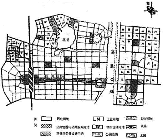 用地布局应注意各类用地规模、布局、不同类用地之间的位置关系等。对不同用地位置关系的考虑一方面是为了避免干扰,比如工业用地对环境有影响。通过读风玫瑰图获得城市主导风情况,将工业用地布置在主导风下风向或侧风向,与居住用地之间适当隔离;另一方面是均衡考虑城市的道路交通组织,避免不同用地之间产生不合理的大流量交通。当有铁路线、高速路、河道等因素分割城区时,应考虑分割因素两侧的交通联系。