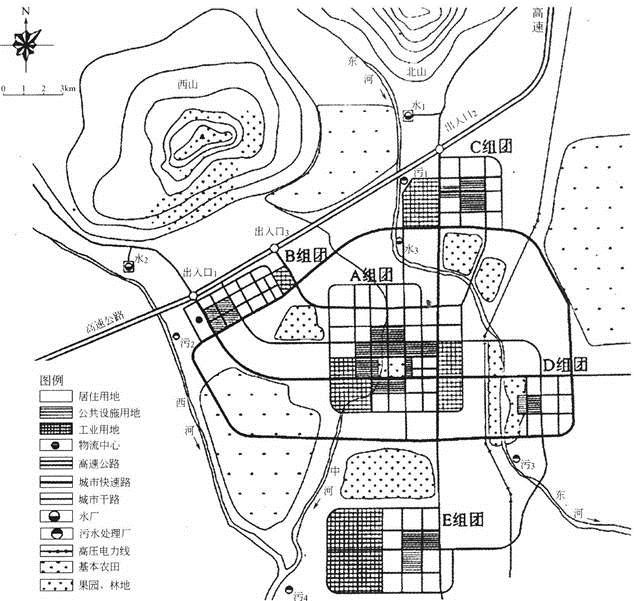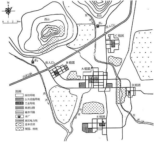 案例题 某地级市总体规划确定,主城区在现状基础上仍分为5个组团,该市地势西北高,东南低,有3条河流,主导风向东北风,主城