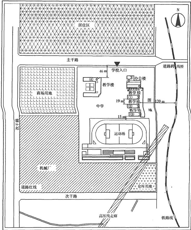 (5)④号教学楼距离城市主干道太近,容易受到噪音干扰。主要教学楼外墙与道路同侧路边距离不应小于80m。