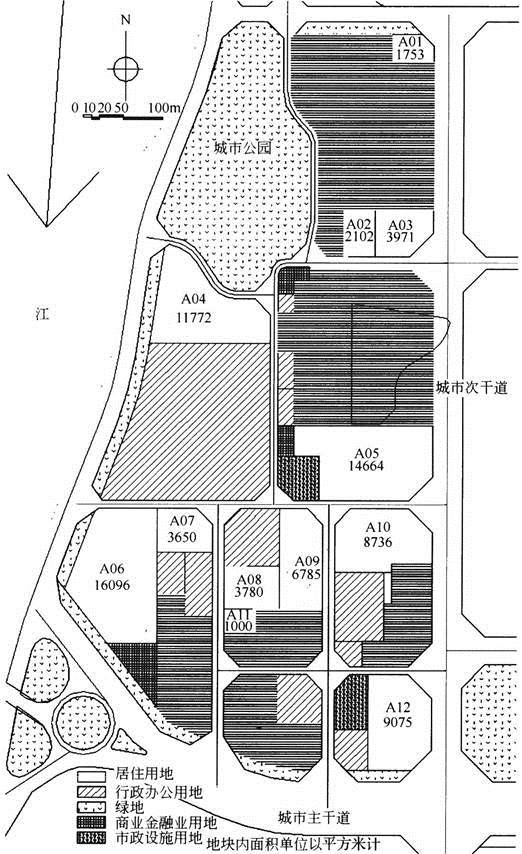 (4)社会停车场(300辆车):A10。一般地,社会停车场用小型机动车停车面积来计算,每车面积为25m2左右,题目要求停车量为300辆车,需要8000m2左右,A10比较合适;A12的面积也接近这个数字,但是A12的位置处在城市主干道与城市次干道的交叉口处,进出停车场车辆与干道上行驶的大量车辆互相干扰,因此A12不合适。
