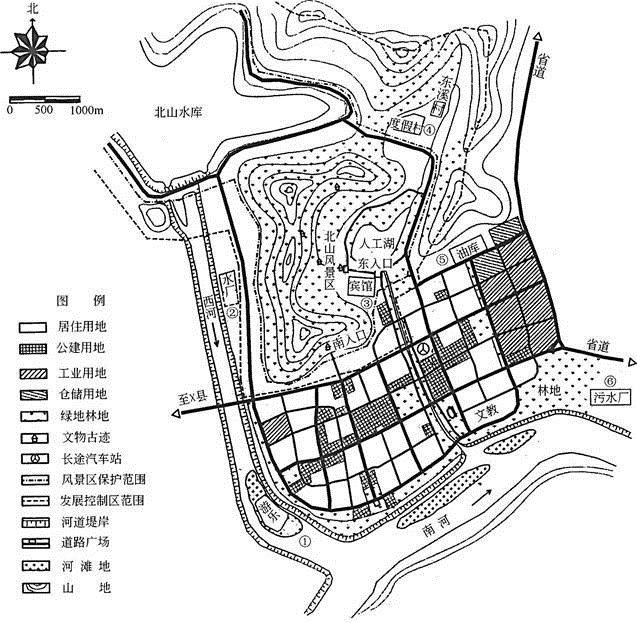 案例题 某小城市依山临河而建。城北为风景区(含北山水库),该风景区按规划保护较好。水库库容属中型,用作灌溉和城市水源,南河水源丰富,西河为水库泄洪道,沿河的人工堤岸能满足城区防洪要求。为发展旅游和完善市政设施等,该市初步拟定建设如下项目(如示意图)。