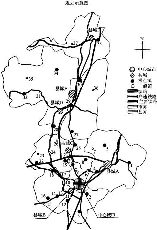 (5)布局:县城B距中心城市(地级市)过近,地域直接受中心城市辐射力度大,将无法发挥地域中心作用,应并入中心城区;县城D、E位置靠近(北部山区,所辖城镇少),应合并形成北部副中心城。