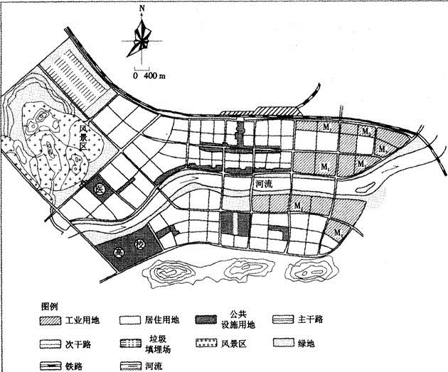 案例题 某市是以省域城镇体系规划为依据拟规划发展人口规模为25万左右的一座新城市。下图示为新城总体规划方案,经专家评审,基本同意方案的框架,但对部分工业用地、部分居住用地以及垃圾填埋场用地等方面提出了应予改进的意见。