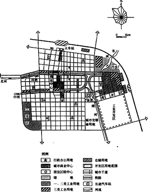 (2)50万人口的城市,商业中心分布不均。从图中可以看出,商业中心主要分布在城市的中部偏西和北部。作为一个大城市来说,除了市级的主要商业中心外,必须在合适的位置设置副中心,以方便市民的消费活动,因此应适当增加商业副中心。