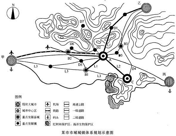 ①C市及B1、B2、B3产业定位工业城市,与A市在区域城镇群内滨海旅游城市性质的定位不符;B3的城市性质与乙市重叠。