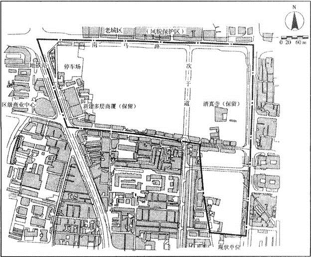 案例题 某开发建设单位申请在某大城市(国家级历史文化名城)市中心的一个地段内进行旧区改造,开发住宅、商业、办公等项目,其性质与城市规划相符。该地块面积约21.8hm2,东、西两侧临城市主干道,南侧为现状(低层)商业街,西侧为已初具规模的区级商业中心,地块周边地区人文环境要素众多,交通繁忙,西侧主干道(二号大街)上有规划地铁线通过,地块现状如图所示。