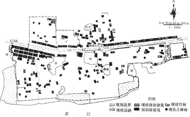 案例题 某村位于某省道北侧,地处南方山区,南边有武江经过,总用地面积约为35万m2。因受灾害除少量现状建筑和菜园外,几乎