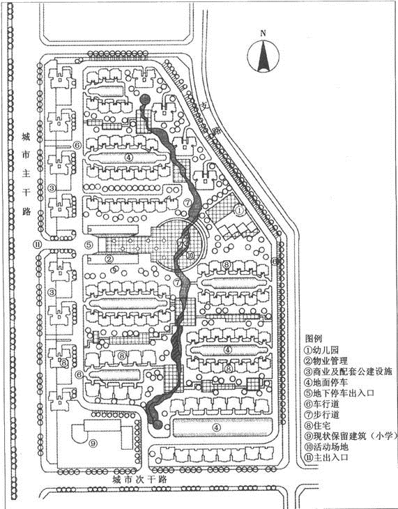 ③小区主要绿地、步行、水景系统纵其南北,位置适中。