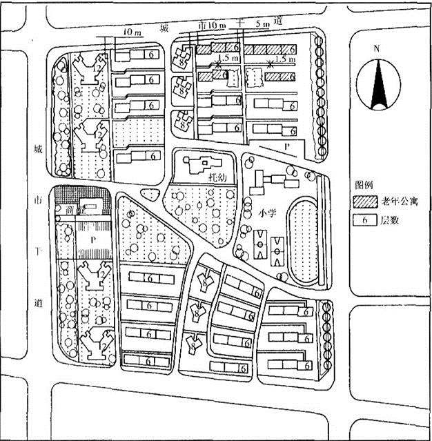 案例题 某居住小区规划方案(见示意图),住宅建筑分为4个组团布置。在东北组团北侧安排了4幢老年公寓。规划提出了以下建设标准和技术要求: