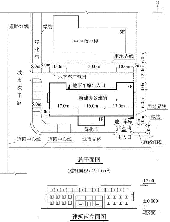 案例题 某北方城市的一家房地产开发企业,通过土地招标出让取得一块开发建设用地(见示意图)。该用地位于传统民居形式建筑风貌保护区内。用地四周情况如下:西侧为城市次干路,红线宽度30m,设5m宽绿化带,用地界线至绿线;南侧为城市支路,红线宽度15m,设5m宽绿化带,用地界线至绿线;北侧为3层砖混结构的中学教学楼,用地界线至围墙;东侧用地界线至围墙。