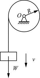 单选题 图示均质圆轮,质量m,半径R,由挂在绳上的重为W的物块使其绕质心轴O转动。设重物的速度为v,不计绳重,则系统动量