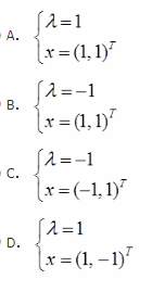 单选题 已知二阶实对称矩阵A的特征值是1,A的对应于特征值1的特征向量为(1,-1)T,若|A|=-1,则A的另一个特征值及其对应的特征向量是( )。