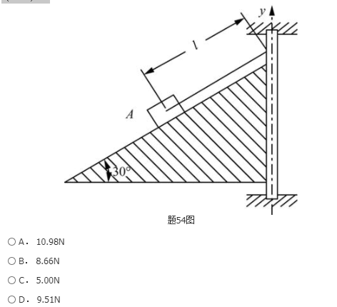 单选题 设物块A为质点,其重为10N,静止在一个可以绕y轴转动的平面上,如图所示。绳长l=2m,取g=10m/s2。当平面与物块以常角速度2rad/s转动时,则绳中的张力是( )。