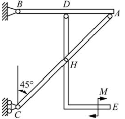 单选题 三杆AB、AC及DEH用铰链连接如图。已知:AD=BD=0.5m,E端受一力偶作用,其矩M=1kN·m。则支座C